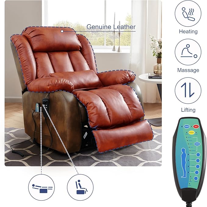 - [Upgraded Massage and Heating] The power lift recliner is equipped with 8 vibration nodes targeting the back, lower back, thighs and legs. There are also 5 vibration massage modes and 3 intensity options. You can enjoy a personalized full body massage experience at home. The lumbar heating function helps reduce fatigue by reducing pressure and improving blood circulation in the lower back.