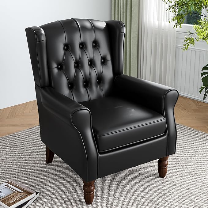 High Back Accent Chair,Upholstered Faux Leather Wingback Armchair with Solid Wood Legs for Small Spaces,Comfy Single Sofa Chair for Living Room,Bedroom,Office-Black