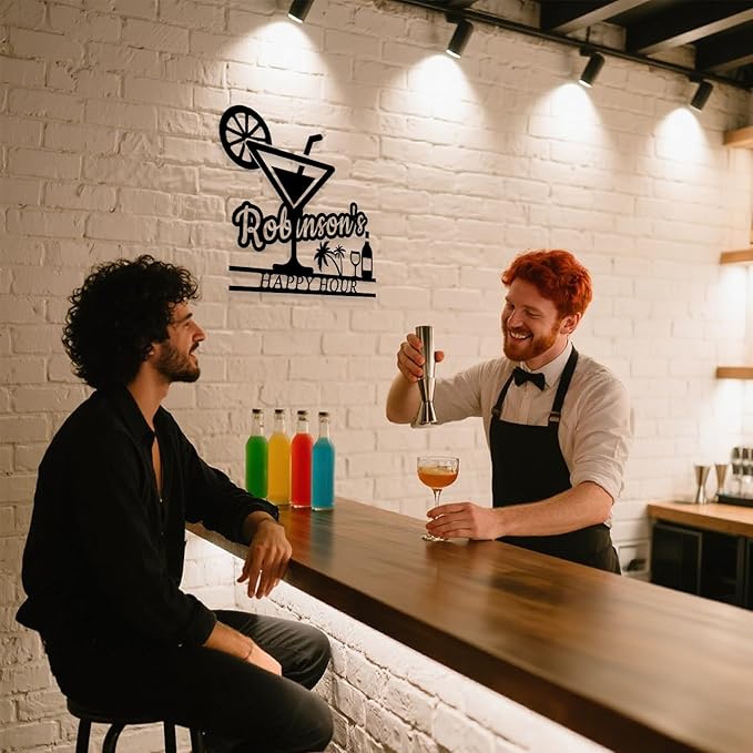 - Customizable Happy Hour Bar Sign: Personalize with names, dates, or witty cocktail quotes (e.g., "It’s 5 O’Clock Somewhere!") on premium metal. Laser-cut designs feature wine glasses, martini motifs, or vintage cocktail shakers—perfect for transforming home bars, kitchens, or patios into lively entertainment hubs. Proudly Made in USA: Crafted locally for rapid turnaround! Ensuring timely gifts or surprises. Quality meets speed