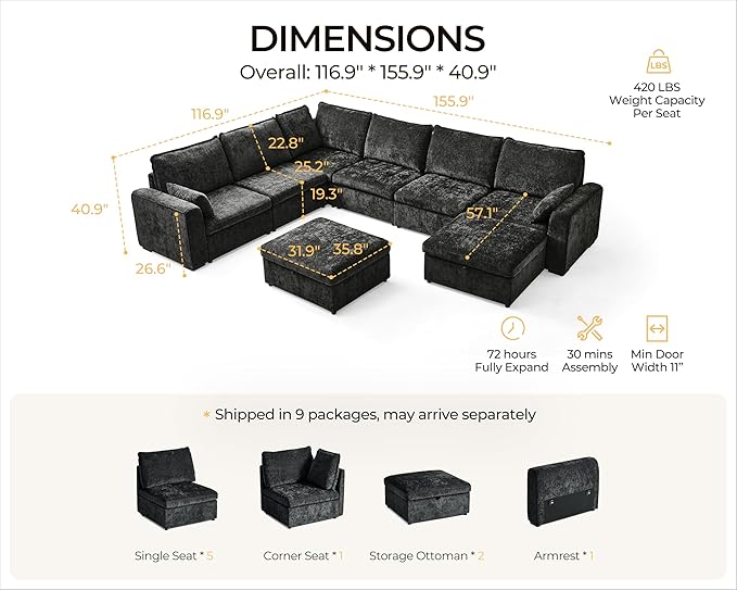 - 【Multiple Packages & Dedicated Support】 Your cloud modular sectional couch ships in 9 separate packages, which may arrive at different times. If you receive only some boxes, don’t worry—more are on the way! Need additional tracking details or assistance? We’re happy to help—just reach out! Our team is here to ensure you receive everything as expected and guarantee a smooth, hassle-free shopping experience with your complete satisfaction