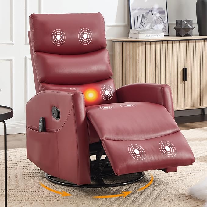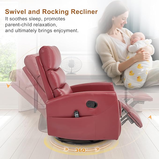 Manual Swivel Rocker Recliner Chair for Adults, Overstuffed Reclining Glider Chair for Nursing with Vibration Massage & Heat, Living Room Rocking Recliner 3-Stage backrest, Faux Leather Red