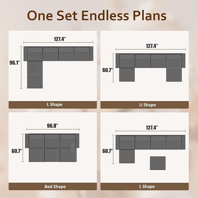 - Modular Sectional: 100% Free combination with 6 pieces individual sections. Make it straight I shape, U shape, L shape, bed shape, etc. Versatilely fits for daily use, family happy hours, party hosting