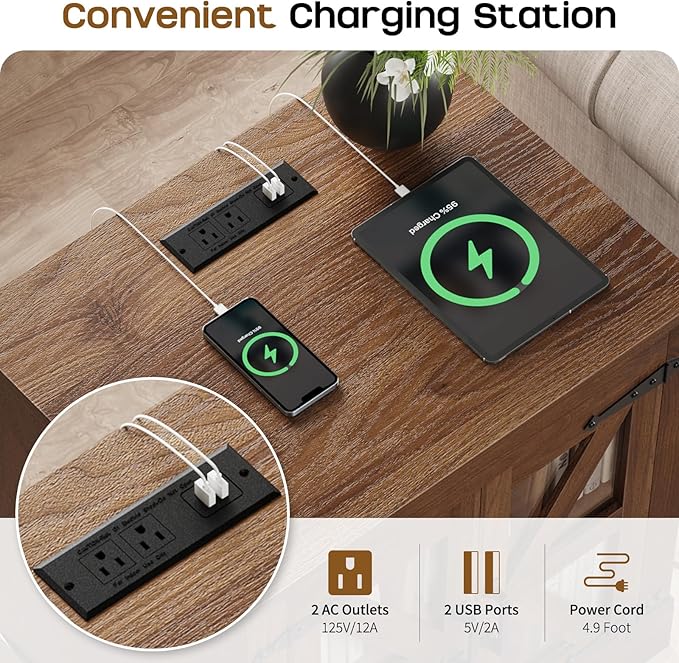 Farmhouse Side Table with Storage Cabinet, End Table with Adjustable Shelf, Night Stand, Wood Nightstand with Charger Station, 24 End Tables Living Room, Rustic Bed Side Tables Bedroom, Walnut