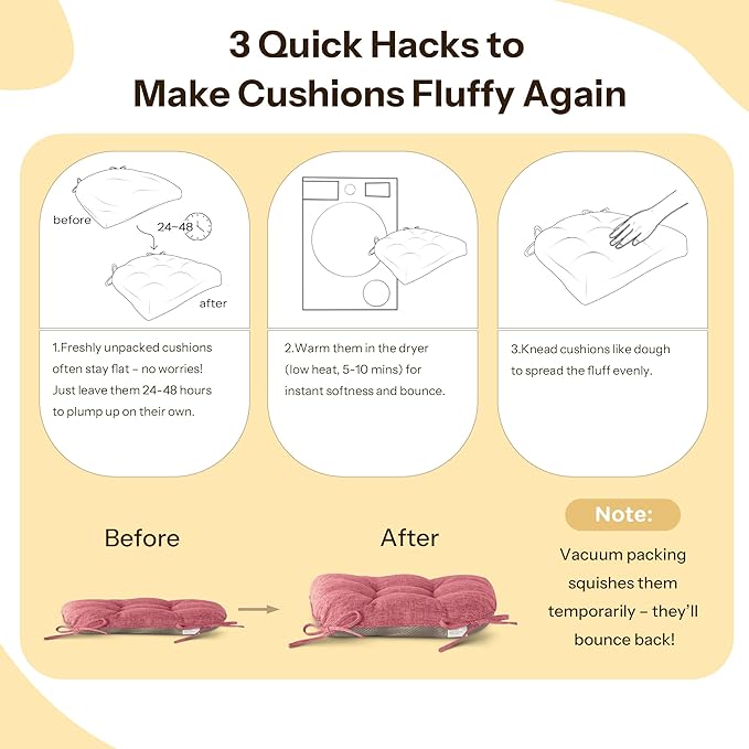 - Large Size Design: Our kitchen chair cushions set of 4 measures 18" x 18" x 3", perfect for most dining chairs, kitchen chairs, and office chairs, instantly transforming hard seats into cozy, stylish seating solutions for any room. The chair cushions for dining chairs are vacuum-packed for shipping. Upon receiving them you can simply follow the easy steps to fluff it for optimal comfort.