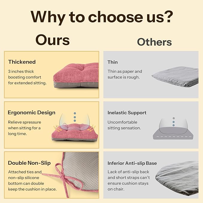 - Versatile Style: Whether you need extra support in the office or want to add a touch of style to your home, our seat cushions for dining chairs are the perfect solution. Use it in dining rooms, home offices, living rooms, bedroom, bars or even breakfast nooks to add comfort and a touch of elegance.