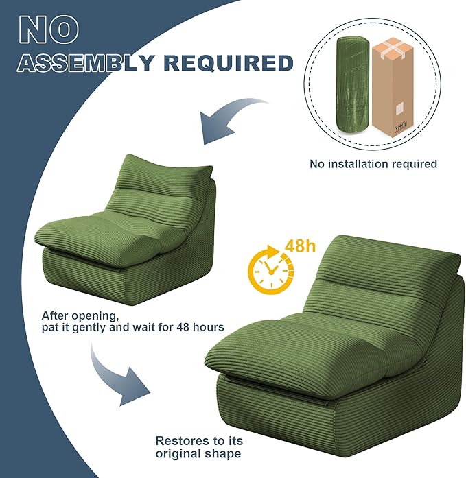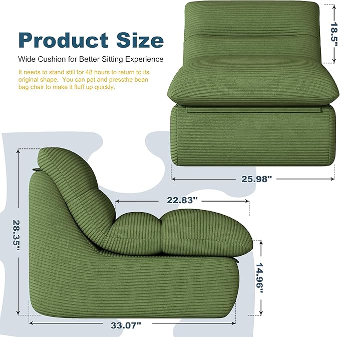 - 【No Assembly Required】There is no need to assemble the beanbag, just open the compressed package and allow it 24-48 hours to regain resilience. After total expansion, you can recline and relish a fantastic time. It's chill to kick back and it's great for watching TV, reading books and even family time. Due to compressed packaging, the fabric may have wrinkles upon opening. Let it sit for 24-48 hours to reach its optimal state. Afterward, you can gently smooth out the fabric or lightly iron it for a more polished look.