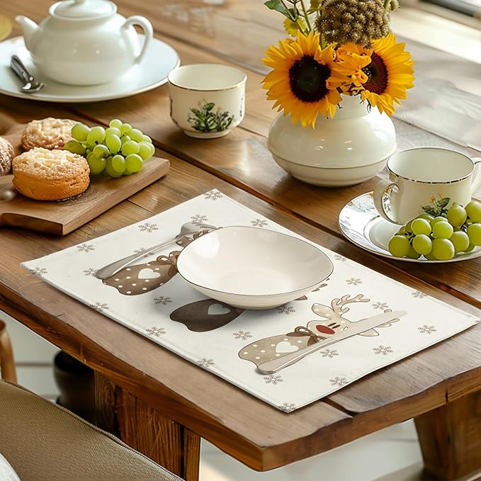 Christmas Reindeer Snowflakes Placemats Set of 4 Xmas Cute Elk Deer Place Mats 12x18 Seasonal Winter Holiday Farmhouse Linen Table Mats for Party Kitchen Dining Outdoor Indoor Decor