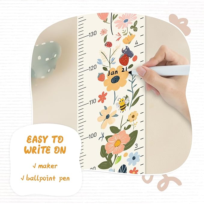 - Design: Kids growth chart with rope at the top of the chart, easy to install and removeable, foldable and portable design, easy to store, hang, roll up, transport, and save space. It boasts a material that's easy to write on, where you can use dark colored ballpoint pens and markers to track growth milestones.