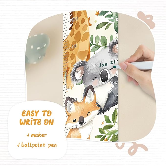 - Design: Kids growth chart with rope at the top of the chart, easy to install and removeable, foldable and portable design, easy to store, hang, roll up, transport, and save space. It boasts a material that's easy to write on, where you can use dark colored ballpoint pens and markers to track growth milestones.