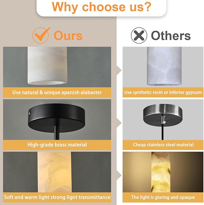 - 【Natural Spanish Alabaster】Alabaster pendant lights kitchen island is made of alabaster imported from Spain, a natural stone solidified by volcanic lava for millions of years. It is strong and durable, and the lighting effect is bright and non-glare. Each piece of alabaster is carefully selected and hand-polished, presenting a delicate and charming appearance, enhancing the natural beauty of the stone.